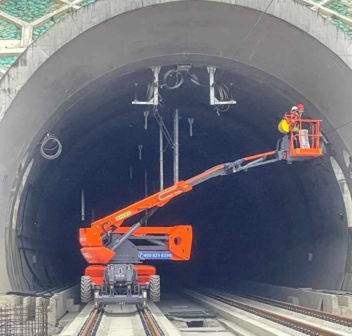 在大型基建項目中,軌道運輸是提升效率的關鍵。鼎力軌道高空車專為隧道內作業設計,具備400kg荷載能力、12km/h的行駛速度,可快速完成設備轉運和人員輸送,適應復雜施工環境。