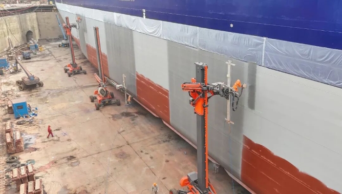 傳統(tǒng)的船體除銹、噴涂作業(yè),長期依賴人工,效率低、成本高、品質(zhì)差,還面臨嚴重的安全與環(huán)保問題。鼎力創(chuàng)新性地將高空作業(yè)平臺與機器人技術(shù)深度融合,打造了一套集成化的智能作業(yè)系統(tǒng),真正實現(xiàn)均勻、高效的除銹與噴涂作業(yè),徹底解決了行業(yè)痛點,為全球船舶修造業(yè)樹立了智能化轉(zhuǎn)型的標桿。